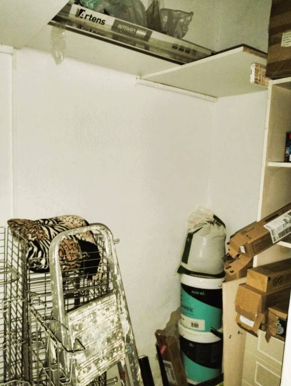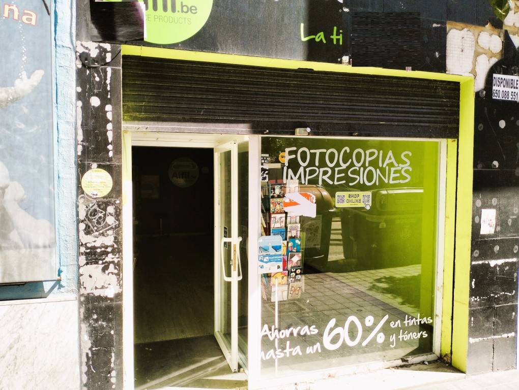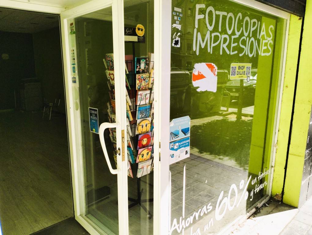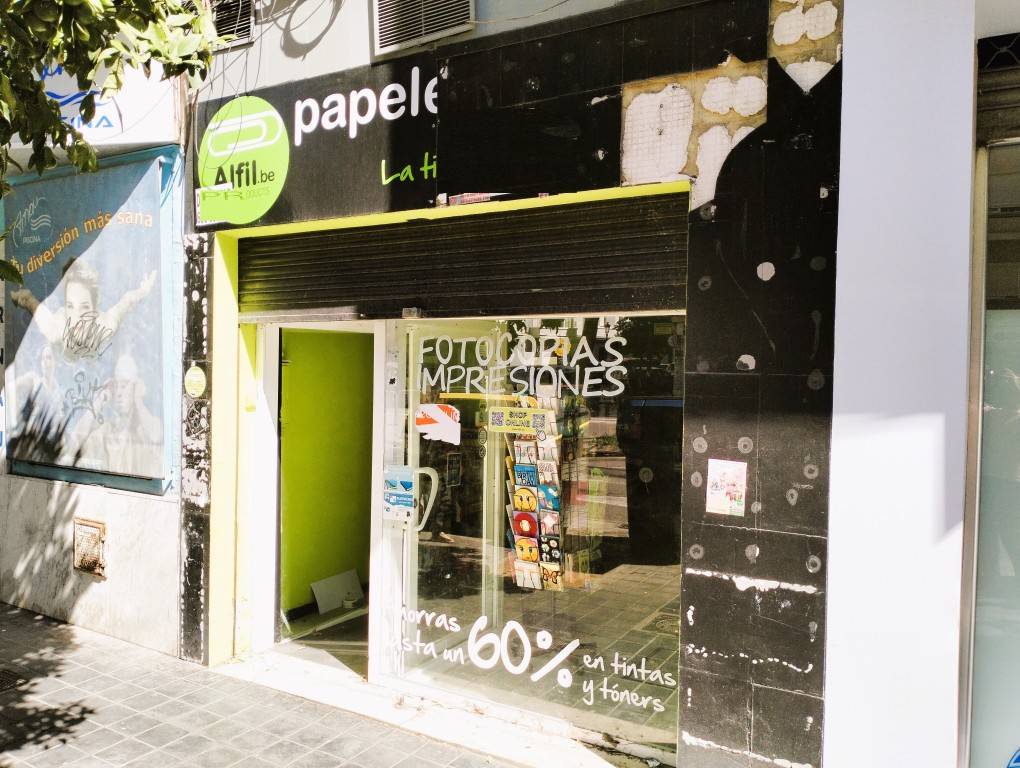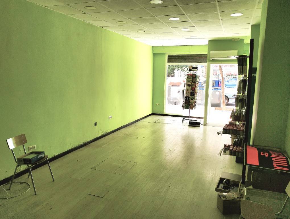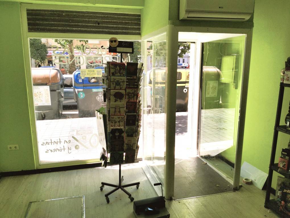 Puerta de entrada de aluminio anodizado blanco, con cerramiento de PERSIANA METÁLICA DE SEGURIDAD, ESCAPARATE, paredes lisas, suelo de tarima flotante en la entrada y terrazo en la trastienda, techo modular desmontable con downlights (iluminación), instalación eléctrica, AIRE ACONDICIONADO por split.