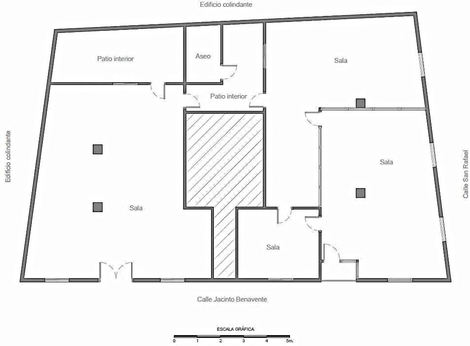 El local es la conjunción de dos locales (una sola referencia catastral) separados en fachada únicamente por el zaguan de entrada del edificio, y unidos por la parte trasera por un patio interior (cubierto).